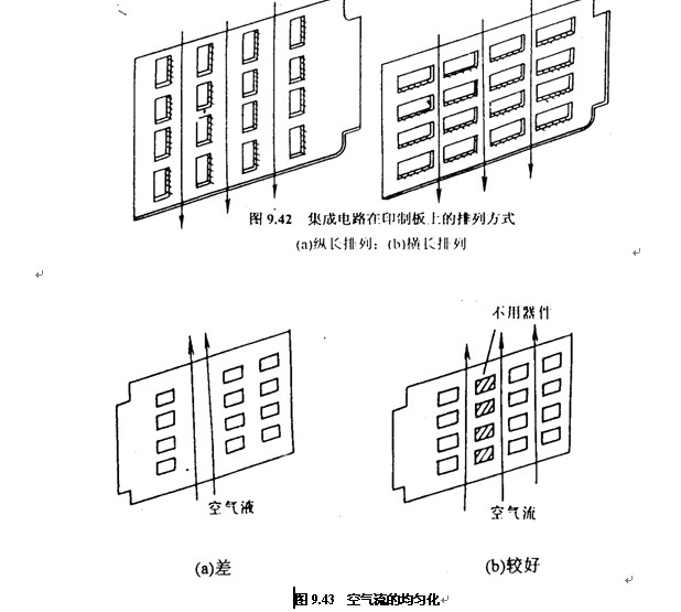 (1)對于采用(yòng)自由對流(liu)空氣冷卻(que)方式的設(she)備,最好是(shi)将集成電(dian)路(或其他(ta)元器件)安(an)縱長方式(shi)排列,如圖(tu)9.42 (a)所示;對于(yu)采用強制(zhì)🏃空氣冷卻(que)(如用風扇(shan)冷卻)的設(she)備,則應按(àn)橫長方式(shi)配置,如圖(tu)9.42 (b)所示。