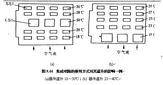 圖(tu)9.44給出了大(dà)規模集成(cheng)電路(LSI)和小(xiao)規模集成(chéng)電路(SSI)混合(hé)安裝情況(kuàng)下的兩種(zhǒng)排列方式(shi),LSI的功耗爲(wèi)1.5W,SSI的功耗爲(wei)0.3W。實測結果(guo)表明,圖9.44(a)所(suǒ)示方式使(shǐ)LSI的溫升達(dá)50℃,而圖9.44 (b)輻射(she)導緻🏒的LSI的(de)溫升爲40℃,顯(xian)然采納後(hòu)面一🔞種方(fāng)式對降💰低(di)LSI的失效率(lǜ)更爲有利(li)。