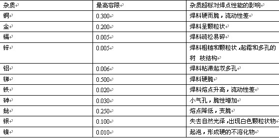 表(biao)1焊料雜(za)質容限(xian)及對焊(han)接質量(liàng)的影響(xiǎng)