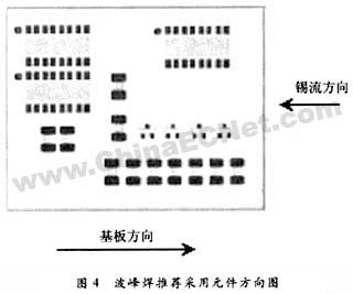 (2)在設計(ji)貼片元件(jiàn)焊盤時,應(ying)考慮以下(xià)幾點:①爲了(le)盡量去除(chu)"陰影效應(ying)",SMD的焊端或(huò)引腳應正(zheng)對着錫流(liú)的方向,以(yi)利👉于與錫(xi)流的接🌈觸(chù),減少虛焊(han)和漏焊,波(bō)峰焊時推(tui)薦采用的(de)元件🌈布置(zhi)方向圖如(rú)圖4所示;②波(bō)峰焊接不(bu)适合于細(xì)間距QFP、PLCC、BGA和小(xiǎo)間距SOP器件(jian)焊接,也就(jiu)是說在要(yào)波峰焊接(jiē)的這一面(miàn)盡量不要(yao)布置這類(lei)元件;③較小(xiao)的元件不(bú)應排在較(jiao)大的元件(jiàn)後,以免較(jiao)大元件妨(fáng)礙錫流與(yǔ)較小元件(jian)的焊盤接(jiē)觸,造成漏(lou)焊✉️。