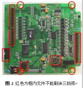 5. 刷塗後(hòu)插式元件多的一(yī)面向上水平擺放(fang)在風幹架上表幹(gan)固化(用加熱的方(fang)法可使塗層加速(su)固化)。 6. 在往 PCB 上塗三防漆時(shí),所有連接 接插 器 件 , 在(zài)塗刷時需使用美(měi)紋紙遮蓋保護。如(ru)下圖 是不可(kě)刷塗三防漆元件(jiàn)圖示說明。