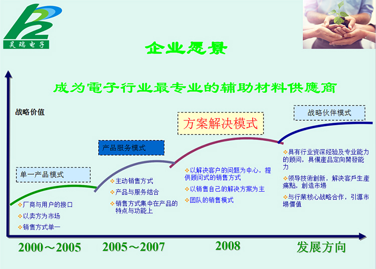 公司(si)宗旨:服務于電子(zi)輔助材料及裝配(pei)行業,堅持以人爲(wei)本,專業領先,誠信(xìn)經營,爲顧客提供(gong)優質的環保産品(pin),爲客戶提供盡善(shan)盡美的服務。立志(zhi)成爲行業内一流(liu)的環保電子制程(cheng)專業解決方案供(gòng)應商。