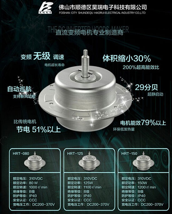 爲響應(yīng)國家電機(jī)效能提升(sheng)計劃,我司(sī)根據抽油(you)煙機存在(zai)的能效比(bǐ)低,轉速慢(màn),形成負壓(yā)不高等問(wen)題,聯合相(xiang)關科研院(yuan)所,行業專(zhuān)家,研發生(sheng)産出适合(he)抽油煙機(jī)系統特點(dian)的直流變(biàn)頻電動機(jī)。