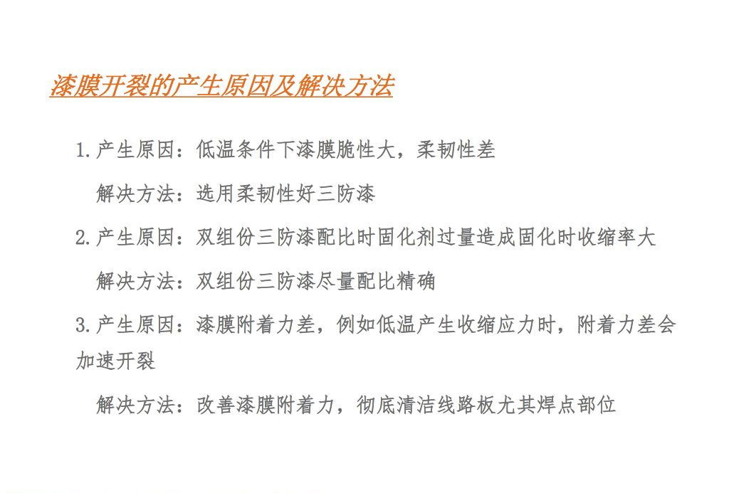 三(san)防漆出現裂(liè)縫主要是因(yin)爲膜厚過厚(hòu),在引腳,元器(qi)件邊緣等表(biao)面張力過大(dà)的地方。